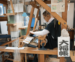 店内に入ってすぐ、巨大な織機が置いてあります。 西陣織の手機で、京都の西陣会館に有るのと同じものです。 現在、現役で動いている手機は全国に何台もありませんが、当店の手機は現役バリバリ、実際に動かして日夜袋帯を帯を制作中です。 当工房制作の帯には、工房らくぜんの帯印が織り込まれています。